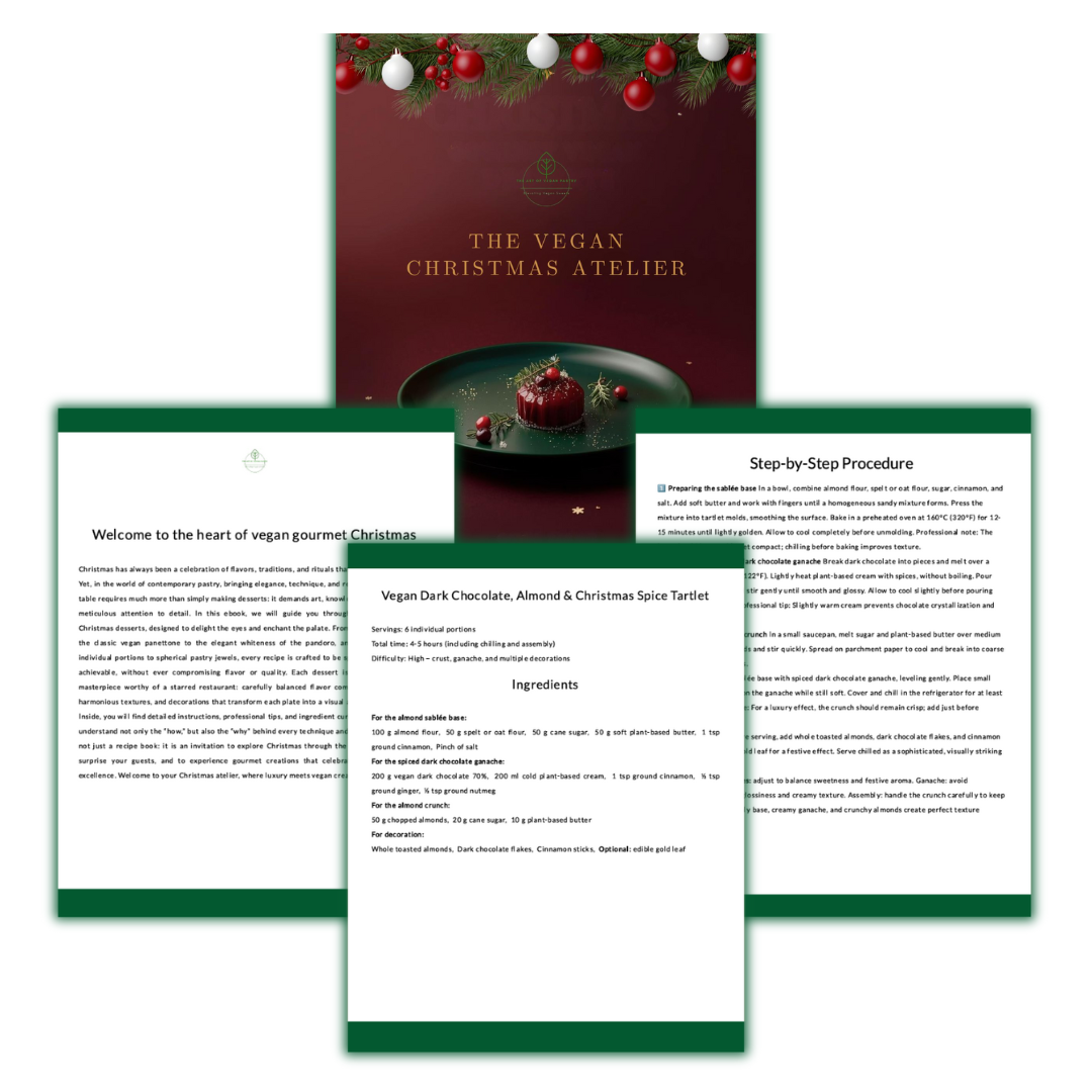 Step into the world of Christmas gourmet vegan pastry with "The Vegan Christmas Atelier", an exclusive journey through elegant, sophisticated, and stunning holiday desserts. This ebook is designed for those who want to create desserts that are not only delicious but also a visual and sensory experience worthy of a high-end restaurant.